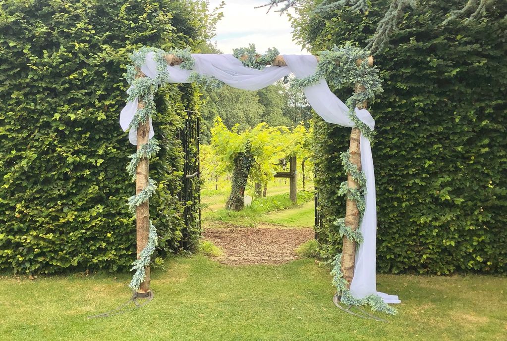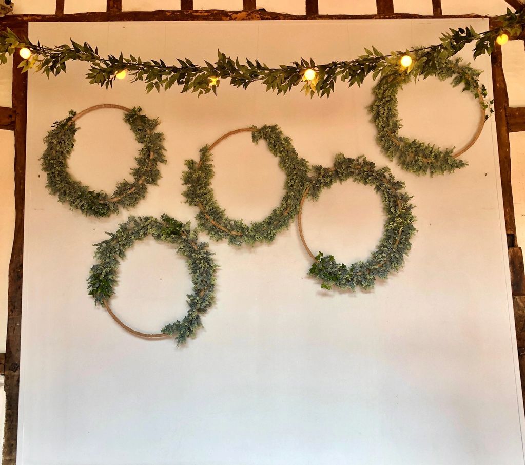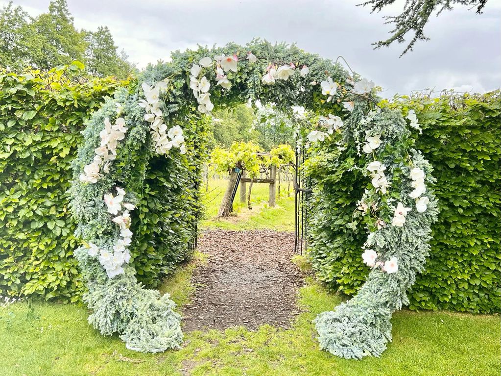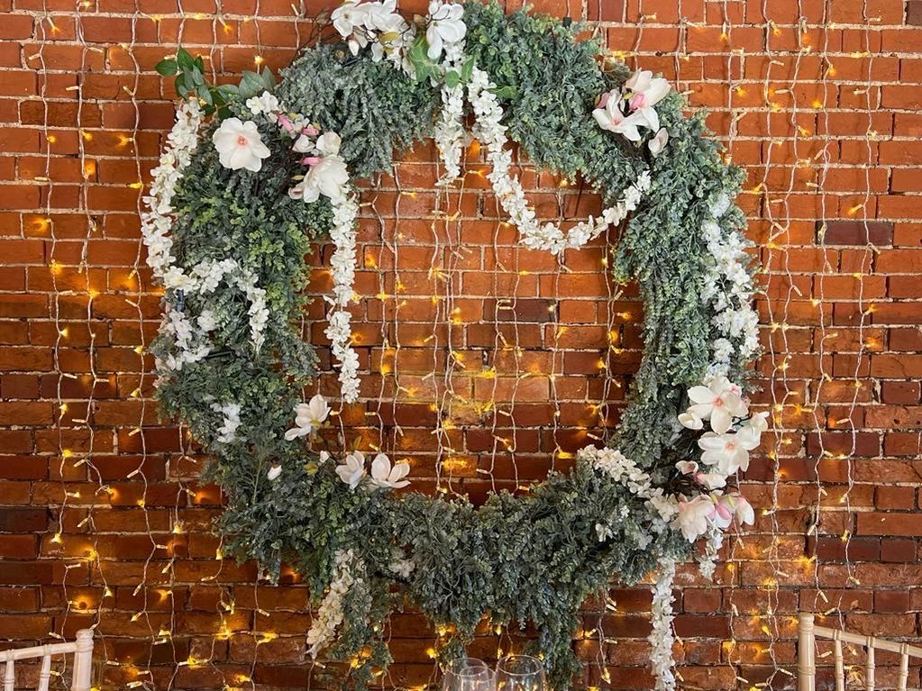 Circle Arch with foliage and artificial flowers. Feel free to add your own real blooms £125