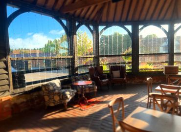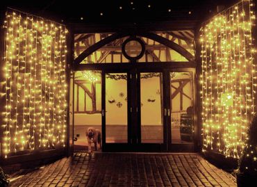 Warm white festoon lighting indoors and outdoors - Criss crossed